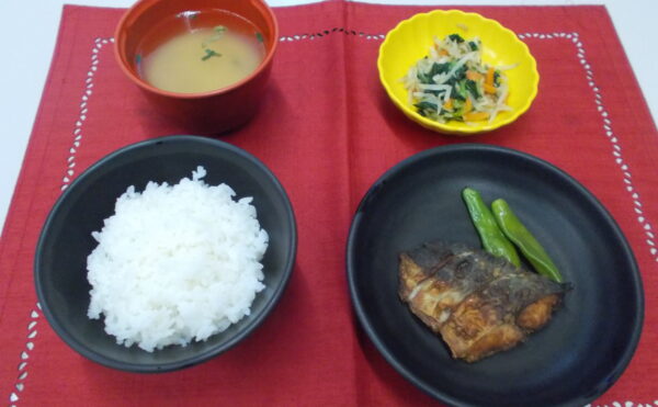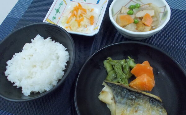 夕食 ご飯 鯖の和風ムニエル 大根の煮物 キャベツの和え物
