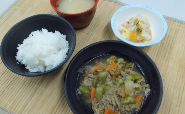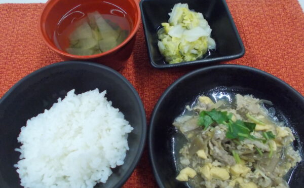 昼食 ご飯 牛肉の柳川風 白菜の甘酢和え 清汁(大根・大根葉)