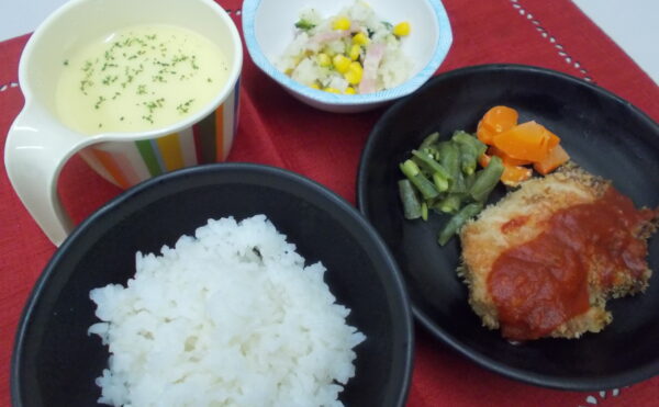 昼食 ご飯 鶏肉のパン粉焼き ベーコンとカリフラワーの炒め物 コーンスープ