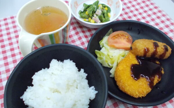昼食 ご飯 ハートコロッケ 菜種和え コンソメスープ