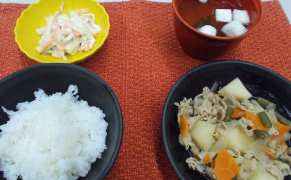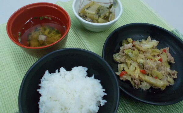 昼食 ご飯 豚肉の大和煮 青菜の煮浸し 清汁(椎茸・ねぎ)