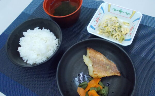 昼食 ご飯 メルルーサの和風ムニエル ちくわと冬瓜の煮物 清汁(オクラ・椎茸)