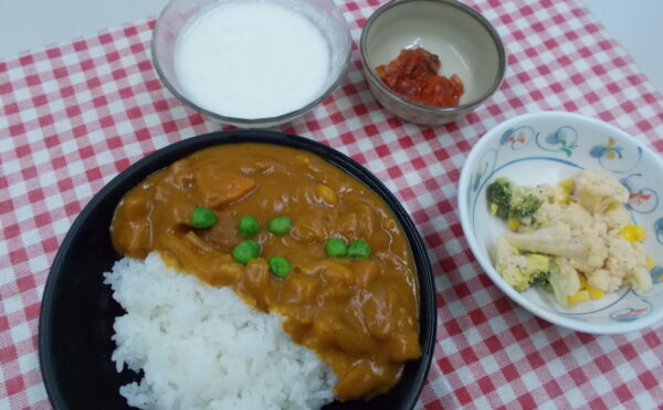 昼食 チキンカレー 枝豆とカリフラワーのサラダ みかんヨーグルト