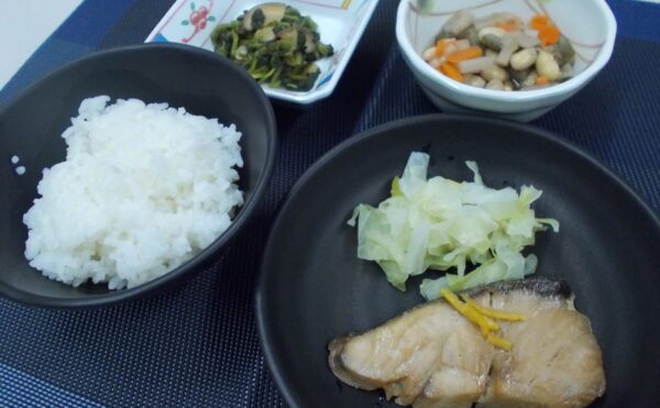 夕食 ご飯 ぶりの幽庵焼き 大豆煮 ほうれん草のポン酢和え