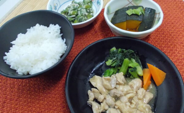 夕食 ご飯 鶏肉の照り煮 かぼちゃの煮物 オクラの和え物