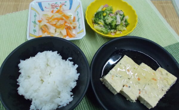 夕食 ご飯 ぎせい豆腐 ブロッコリーの炒め物 キャベツの和え物