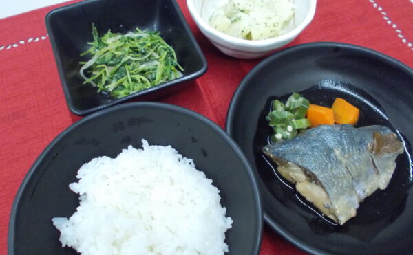夕食 ご飯 鯖の香味焼き キャベツの炒め煮 小松菜のピーナッツ和え