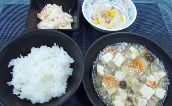 夕食 ご飯 豆腐のきのこそぼろ煮 カリフラワーの炒め物 マカロニサラダ