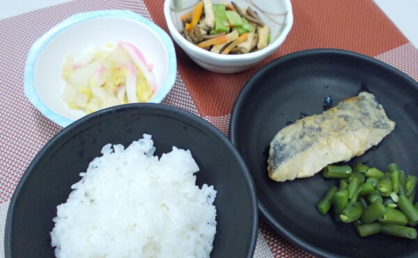 夕食 ご飯 松風焼き チンゲン菜のソテー いんげんの青じそ和え