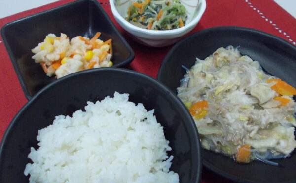 夕食 ご飯 豚肉と春雨の旨煮 もやし炒め カリフラワーのサラダ