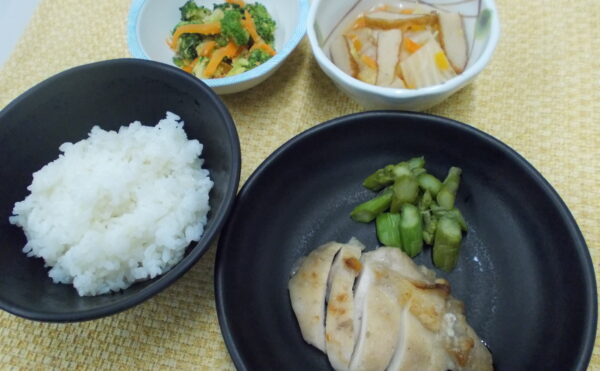 夕食 ご飯 鶏肉の梅風味焼き 白菜の煮浸し ブロッコリーのピーナッツ和え