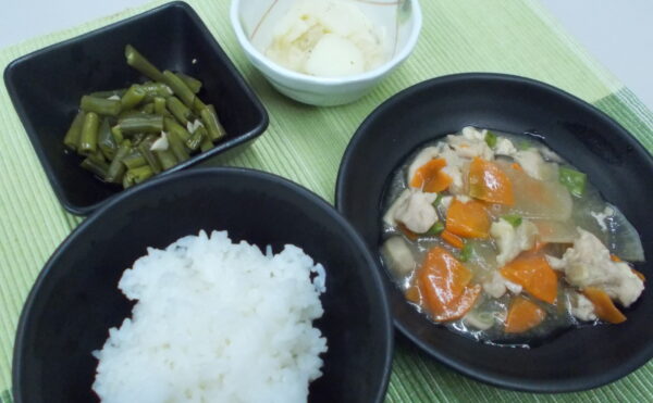 夕食 ご飯 鶏の治部煮 じゃが芋の炒め物 いんげんの青じそ和え