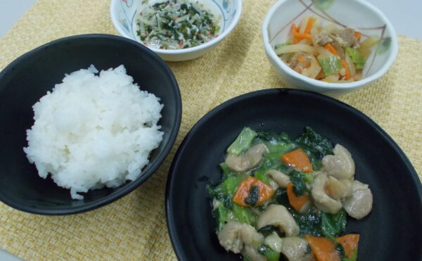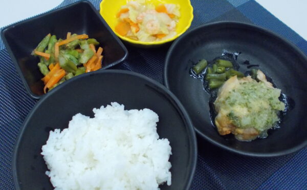 夕食 ご飯 鶏肉の香味ソース 海老と白菜の旨煮 アスパラの和え物