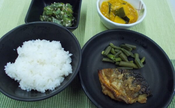 夕食 ご飯 鯖のごま風味焼き 南瓜のそぼろ煮 オクラのおかか和え