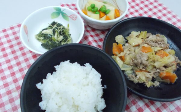 夕食 豚肉と野菜の炒め物 じゃが芋の煮物 小松菜とささみの青じそ和え