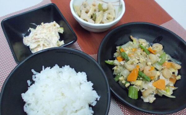 夕食 ご飯 海老と卵の炒め物 蓮根の甘辛煮 ツナサラダ