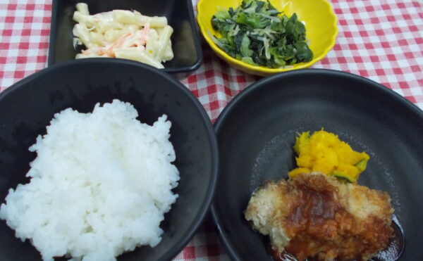 夕食 ご飯 鶏肉のパン粉焼き チンゲン菜のソテー マカロニサラダ