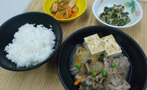 夕食 ご飯 肉豆腐 ピーマンの炒め物 しろなとカニの和え物