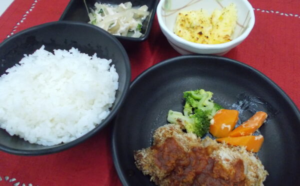 夕食 ご飯 鶏肉のパン粉焼き じゃが芋のチーズ焼き 大根サラダ