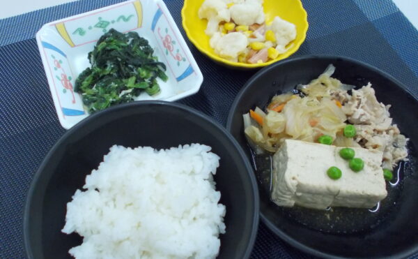 夕食 ご飯 肉豆腐 カリフラワーの炒め物 ほうれん草のしらす和え