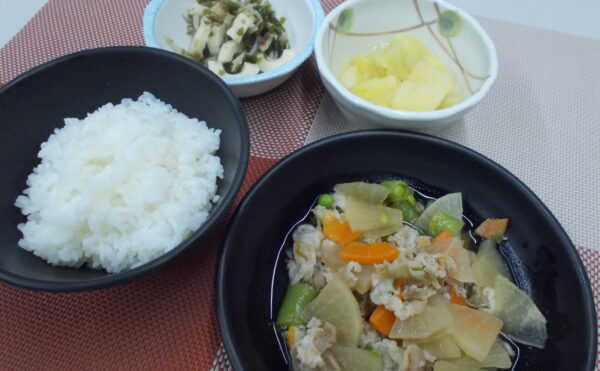 夕食 ご飯 豚肉と大根の生姜煮 さつま芋の甘煮 わかめともやしの酢の物