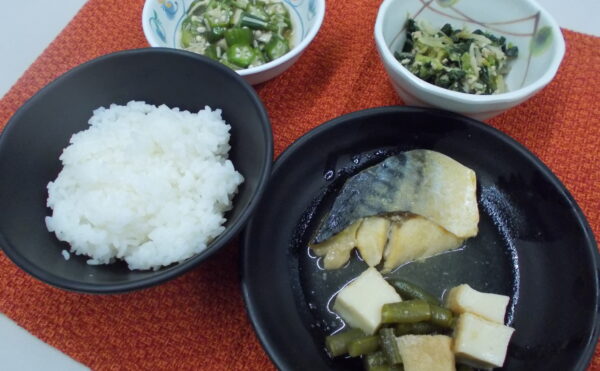 夕食 ご飯 鯖の味噌煮 チンゲン菜ともやしの炒め物 オクラのドレッシング和え