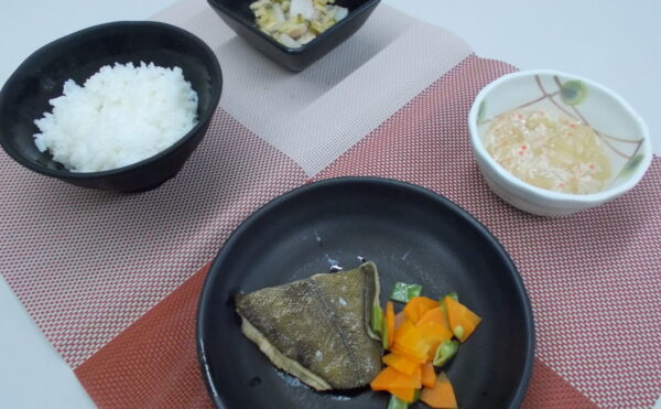 夕食 ご飯 カレイの煮付け 冬瓜のくず煮 白菜の梅和え