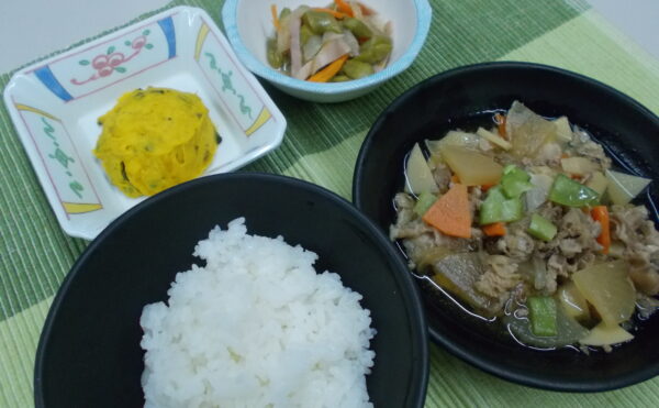 夕食 ご飯 豚肉の大和煮 アスパラの炒め物 かぼちゃサラダ