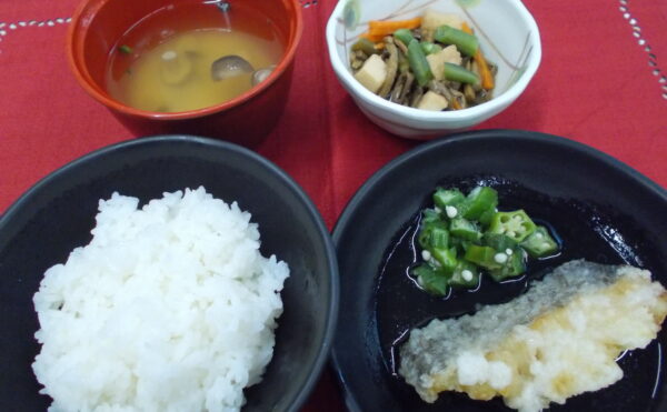 昼食 ご飯 白身魚の揚げだし ぜんまいの煮物 みそ汁(しめじ・ねぎ)