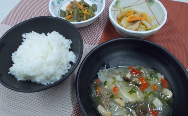 夕食 ご飯 たらの野菜あんかけ さつま揚げの煮物 いんげんのわさび和え
