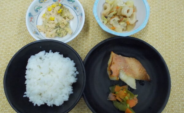 夕食 ご飯 赤魚の西京焼き ちくわとキャベツの炒め物 花野菜サラダ