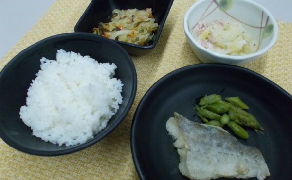 夕食 ご飯 たらのムニエル じゃが芋の炒め物 キャベツの塩昆布和え