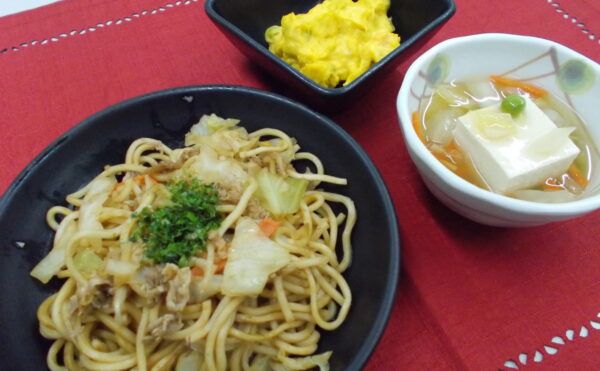 昼食 焼きそば 豆腐の野菜あんかけ かぼちゃサラダ