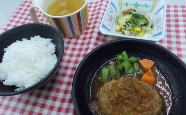 昼食 煮込みハンバーグ ソーセージと野菜のソテー コンソメスープ